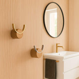 Sweet and very elegant wooden hook made of light, solid oak and with a half circle of brass that acts as hooks.