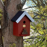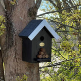Ophængning er enkelt med et praktisk hul på bagsiden til søm eller skrue. Placer kassen mellem 1,5 til 3 meter over jorden, helst med fronten mod nord eller øst, men en skyggefuld sydlig placering fungerer også fint.