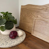 Gjesing skærebrættet er udformet et i et praktisk, rektangulært design, som har en buet, organisk topkant, der som designelement går igen på et andet af mine produkter i shoppen - den aflange svævehylde.
